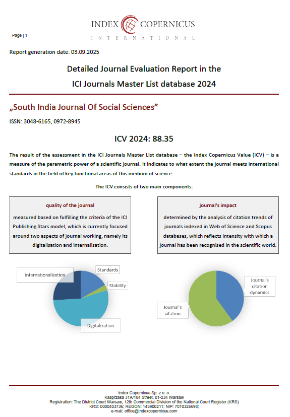 The South India Journal of Social Sciences (SIJSS) is pleased to share a significant milestone. Having received its Online ISSN in 2024, and within this short span, the journal has earned an Index Copernicus Value (ICV) of 88.35 for 2024 in the ICI Journals Master List (Index Copernicus ).